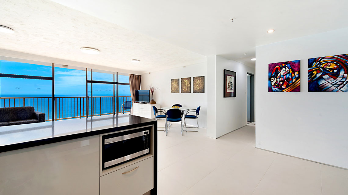 Absolute beachfront apartment, with sensational views of beach, ocean, river and city, from wrap around balcony off the living area. Perfect spot for beach holiday.